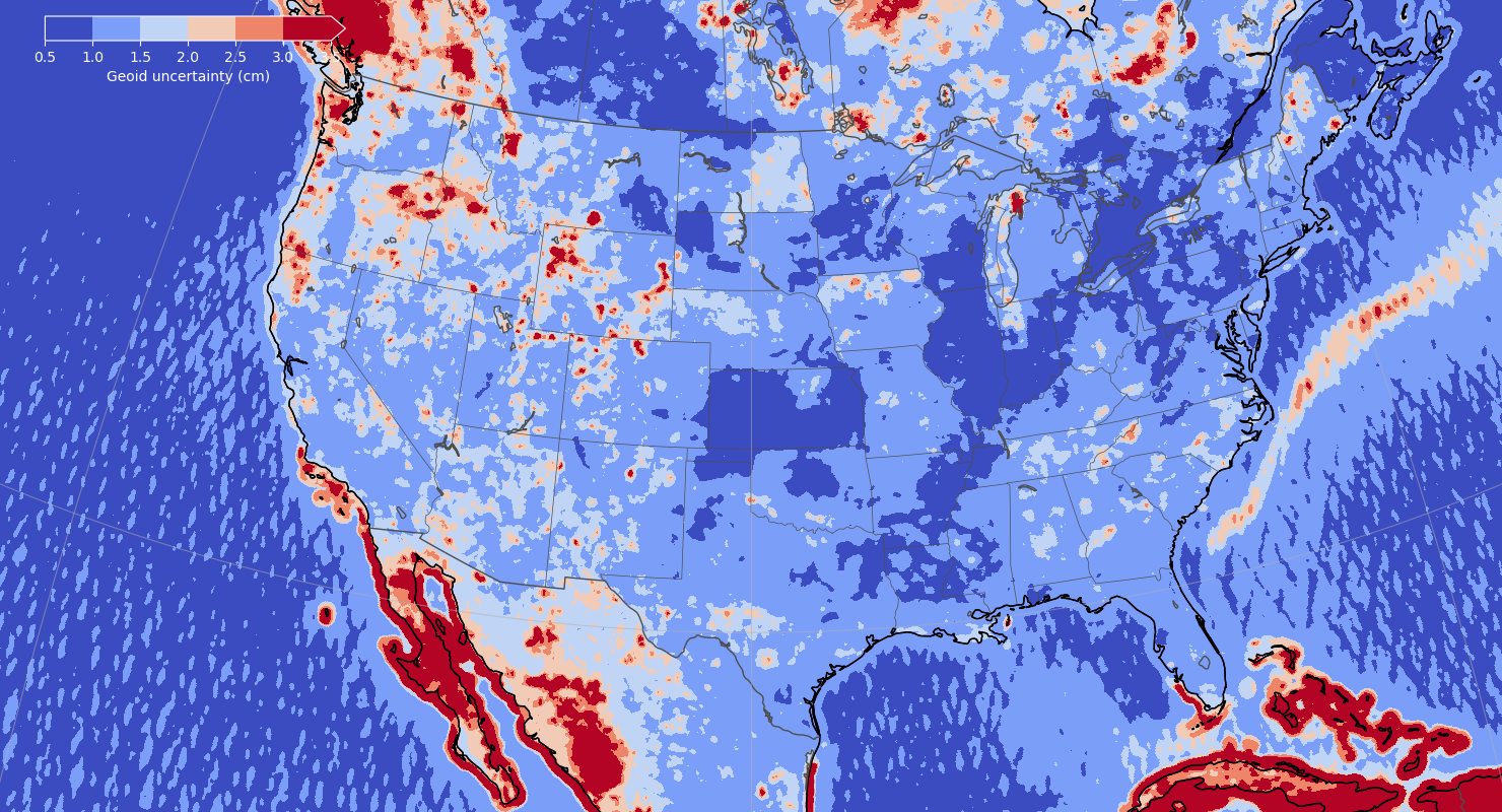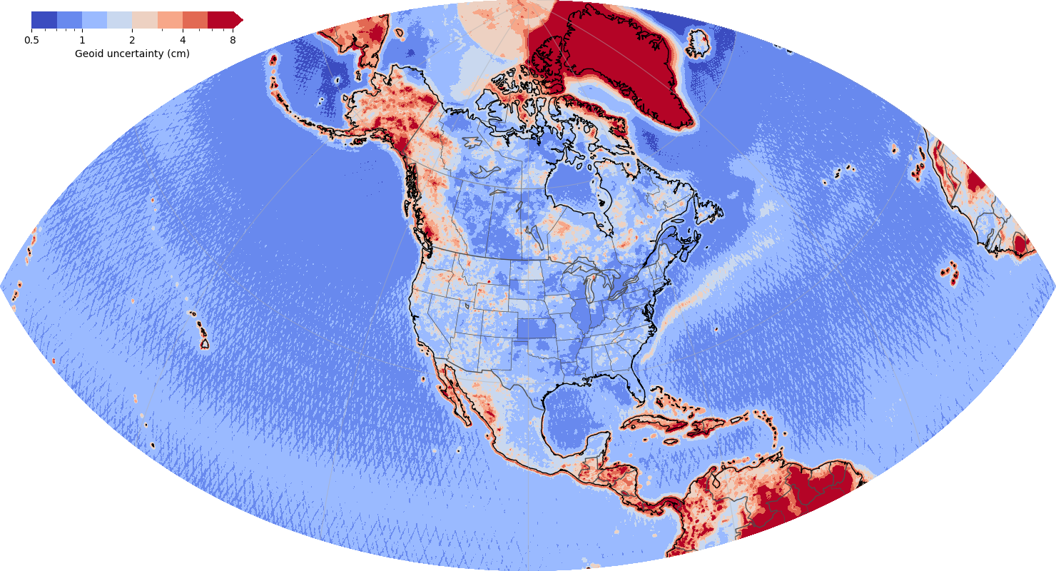 Map of GEOID2022 beta estimated 1-sigma uncertainties, select this link for a higher resolution version.